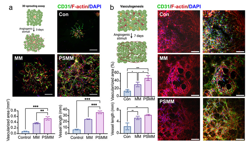 为了提高微凝胶的可注射性和与受损部位的整合能力,研究人员在微凝胶支架内引入了Matrigel/Collagen I (M/C)作为基质。M/C的引入不仅提升了可注射性,保证了细胞在注射过程中的活性,还显著增强了支架的促血管生成作用。HUVEC/MSC体外共培养实验表明,PSMM支架的血管长度为MM组的1.48倍,显示出更优越的血管化效果(图2)。同时HUEVC和HEF的混和培养也证明了两种微凝胶组的血管化面积都显著增加,但PSMM支架显示出更优的血管化效果。结合微凝胶支架孔隙统计结果(PSMM组微小孔隙占比明显高于MM组),推测可能是由于PSMM组内部微孔隙的存在为血管的形成和迁移提供了更多的空间。