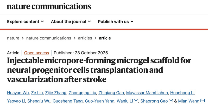 近日,同济大学生命科学与技术学院高绍荣院士团队王冕研究员与上海交通大学李婉露教授团队在Nature Communications期刊上合作发表题为“Injectable Micropore-forming Microgel Scaffold for Neural Progenitor Cells Transplantation and Vascularization after Stroke”的研究论文。该研究开发了一种相分离微孔微凝胶(PSMM)-基质复合支架,可用于高效递送神经祖细胞(NPCs),能够通过促进血管生成和细胞存活,显著改善卒中大鼠的神经功能恢复。