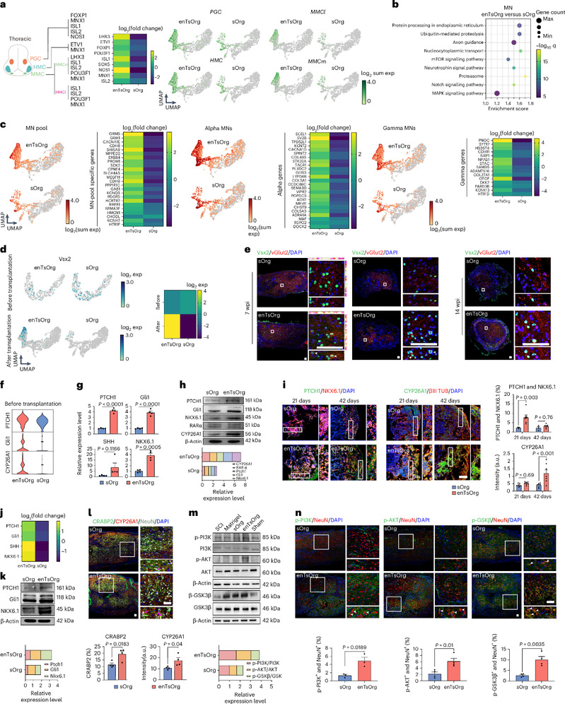 机制研究表明,LDH在类器官生成阶段通过激活PTCH1调控Sonic Hedgehog(SHH)信号通路,并通过调节视黄酸(RA)信号,促进胸段运动神经元的精确分化和背腹结构模式化;在移植后继续维持PI3K/AKT/GSK3β等神经保护与轴突再生通路活化,配合MFN2和UCHL1等关键基因的高表达,增强了移植物细胞的存活及与宿主组织的融合能力。此外,enTsOrg在移植后能产生成熟的Alpha型和Gamma型运动神经元、中位运动柱及腹外侧运动柱等多种胸段特异性亚型,并保留对Vsx2+/vGlut2+关键中间神经元的支持作用,这一类神经元在重建步行相关神经回路中发挥重要作用。