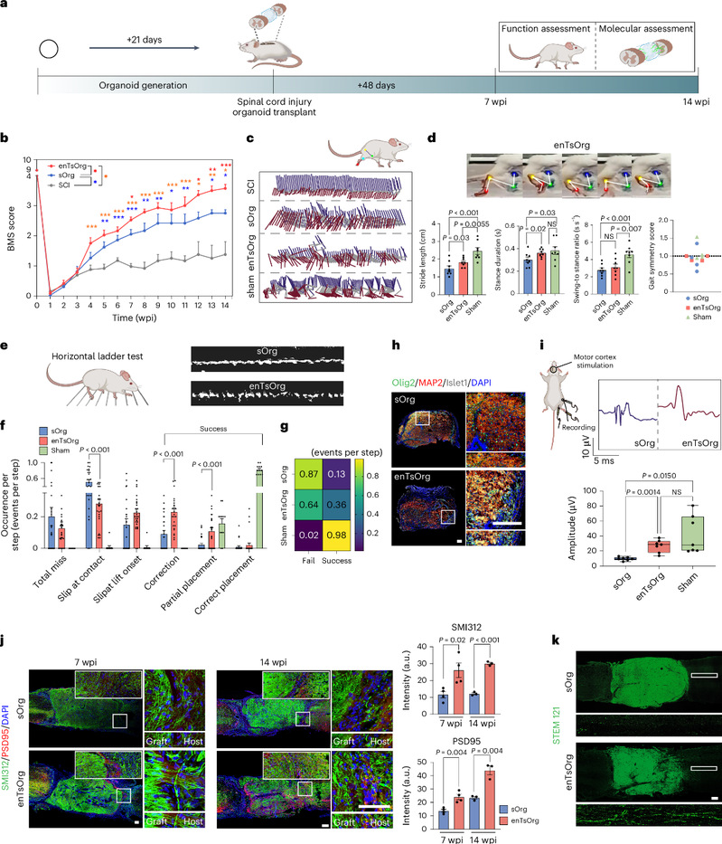 图2. 将enTsOrg移植到胸段脊髓损伤模型中可显著恢复动物运动和神经功能