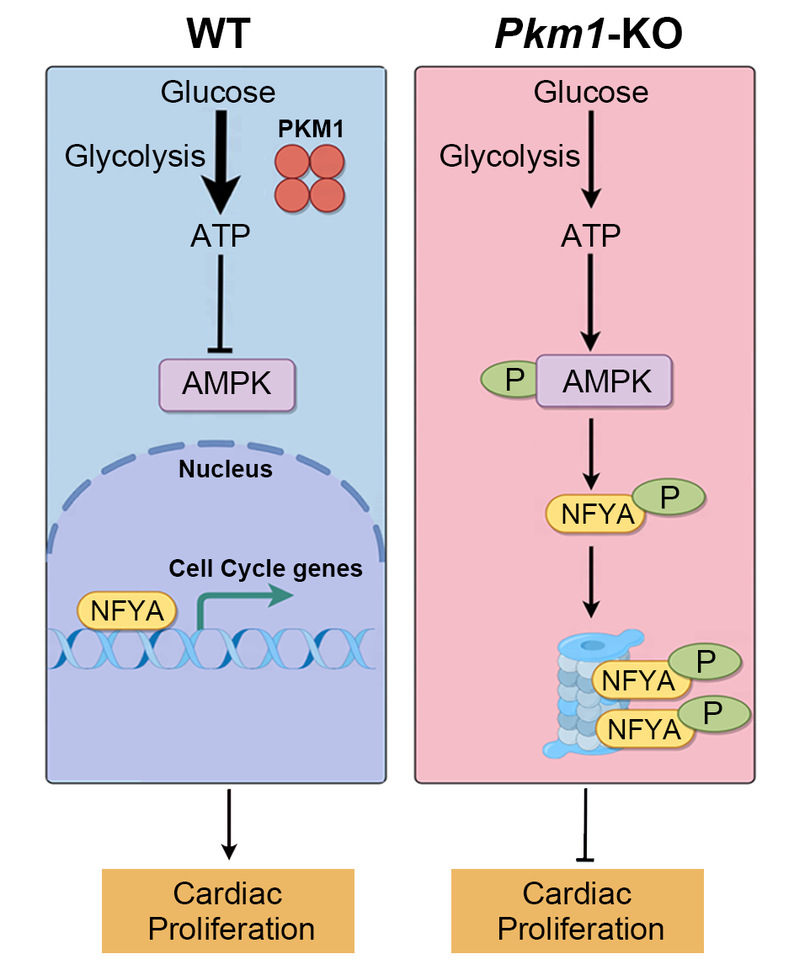 综上,该研究首次在排除PKM2代偿性上调的背景下,明确了PKM1在胚胎心肌细胞增殖和心脏发育中的必需作用,提出了一个从代谢稳态、能量感知到转录调控的分子机制框架。研究揭示PKM1通过维持能量供给抑制AMPK异常激活,从而保护NFYa稳定性,进而驱动心肌细胞增殖和心脏结构的正常形成。这一发现不仅丰富了我们对能量代谢与心脏发育之间关系的理解,也为阐释先天性心脏病的代谢基础及未来潜在干预策略提供了新的理论依据。