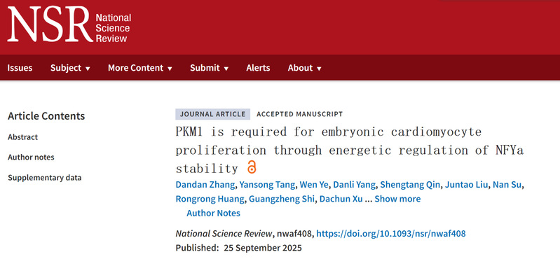 近日,同济大学生命科学与技术学院康岚教授、高绍荣院士团队与魏珂教授团队在National Science Review期刊上在线发表了题为“PKM1 is required for embryonic cardiomyocyte proliferation through energetic regulation of NFYa stability”的研究论文。该工作通过构建一种在PKM1缺失背景下不伴随PKM2代偿性上调的小鼠模型,系统揭示了PKM1在维持能量稳态和促进心肌细胞增殖中的关键作用。