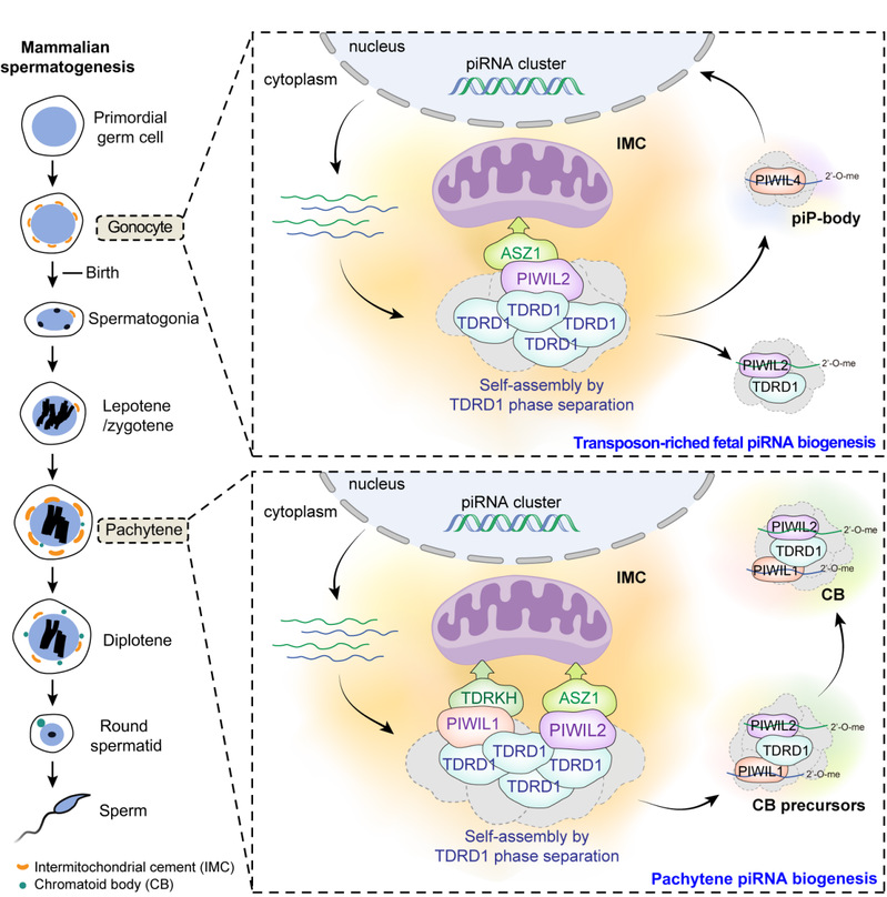 综上所述,该研究揭示了在哺乳动物精子发生过程中piRNA加工复合物在线粒体膜上的动态组装过程:在胚胎期以及新生小鼠的性原细胞(gonocyte)中,ASZ1-PIWIL2-TDRD1作为核心组分,启动piRNA加工复合物的组装;在减数分裂期的粗线期精母细胞中,ASZ1-PIWIL2-TDRD1和TDRKH-PIWIL1-TDRD1两个复合物共同促进piRNA加工复合物的组装。PIWI蛋白与piRNA结合破坏了PIWI蛋白与线粒体膜蛋白的相互作用,促使PIWI-piRNA复合物离开线粒体膜,进一步被运输到发挥功能的区域。该工作对于理解piRNA生成的分子机制具有重要意义。
