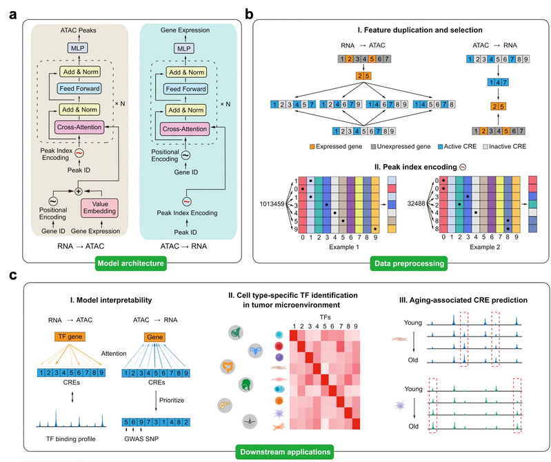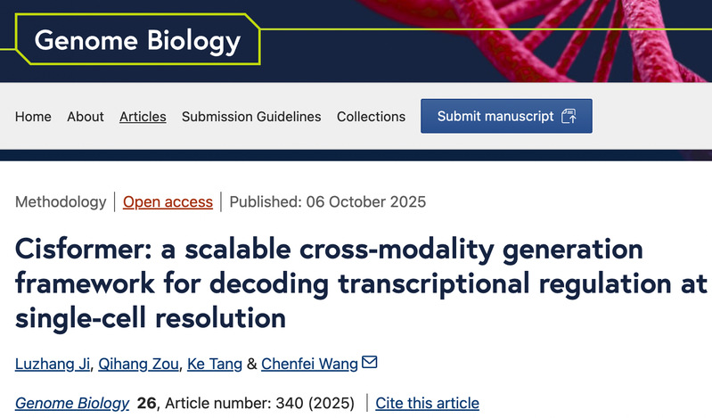 2025年10月6日,同济大学生命科学与技术学院王晨飞团队在Genome Biology上发表了文章Cisformer: a scalable cross-modality generation framework for decoding transcriptional regulation at single-cell resolution。该研究开发了基于跨注意力机制的生成式人工智能模型Cisformer(https://github.com/wanglabtongji/Cisformer),用于单细胞分辨率的基因表达与染色质可及性数据的生成。综合考虑模型的复杂性与可解释性,Cisformer采用“decoder-only”的模型架构,创新性地提出了对染色质可及性数据相关的超长序列使用特征重复与选择以及新型索引编码处理。Cisformer具有优秀的单细胞数据生成能力与模型可解释性,能在癌症发生与器官衰老等重要生物学过程中鉴定潜在细胞类型特异的重要调控元件与转录因子(图1)。