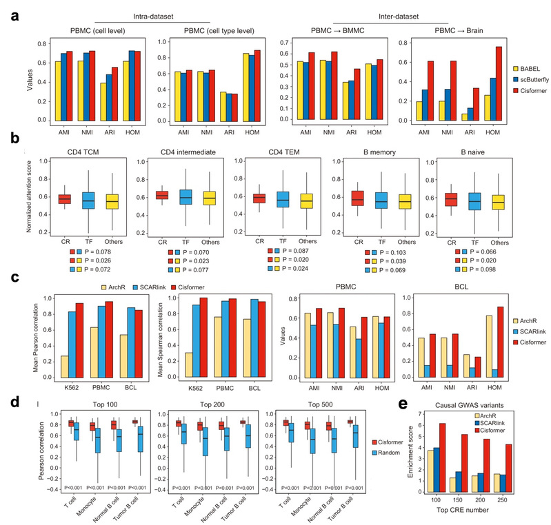 研究人员通过多项测试发现,Cisformer在不同来源的单细胞多组学数据中表现出优异的数据生成能力与模型可解释性。当利用单细胞转录组数据生成表观组数据时,相较于BABEL和scButterfly,Cisformer生成的单细胞染色质可及性数据更好地保留了细胞类型特异性。此外,Cisformer通过模型内在的注意力机制,揭示了不同类型的基因对染色质可及性调控强度的差异。当利用单细胞染色质可及性数据生成转录组数据时,Cisformer预测得到的基因表达谱比ArchR和SCARlink更接近真实数据,同时能更好地建立非编码元件与其靶基因的关联(图2)。