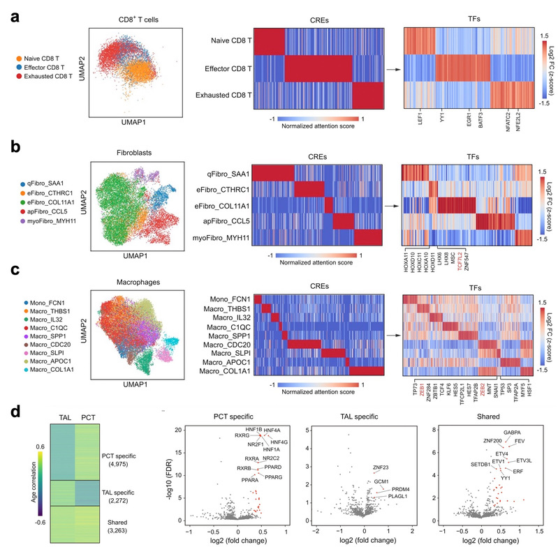 此外,研究人员进一步将Cisformer应用于肿瘤发生与器官衰老这两个重要的生物学过程中。Cisformer在利用单细胞染色质可及性数据生成基因表达信息后,通过注意力机制分别从人类CD8+ T细胞、成纤维细胞以及巨噬细胞中识别出亚型特异的转录因子,其中部分与相关文献报道相符。而针对小鼠肾脏衰老过程,Cisformer通过单细胞转录组数据生成染色质可及性数据,鉴定出了衰老相关肾脏细胞特异与共同的潜在调控元件与转录因子(图3)。综上,该项研究不仅证明了基于注意力机制的语言模型在单细胞跨模态生成任务中的适用性,还揭示了生理与病理状态下转录组与表观组相互作用的分子机制,为癌症的临床诊疗与器官衰老的有效干预提供了重要的研究视角与理论指导。