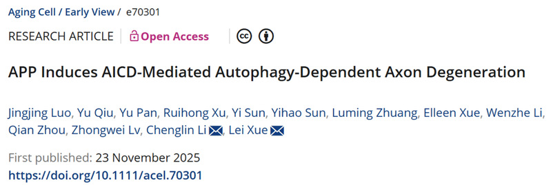 2025年11月23日,同济大学生命科学与技术学院薛雷教授团队在国际知名期刊《Aging Cell》上发表了题为“APP Induces AICD-Mediated Autophagy-Dependent Axon Degeneration”的研究论文。该研究首次揭示了阿尔茨海默病关键蛋白APP通过其胞内结构域AICD,而非传统认为的Aβ,诱发年龄依赖性神经轴突退变的分子机制,并明确了自噬通路及下游dFoxO/Snail-Atg1轴在其中扮演的关键角色。这一发现为深入理解阿尔茨海默病的发病机制及开发新的治疗策略提供了重要理论依据和潜在靶点。