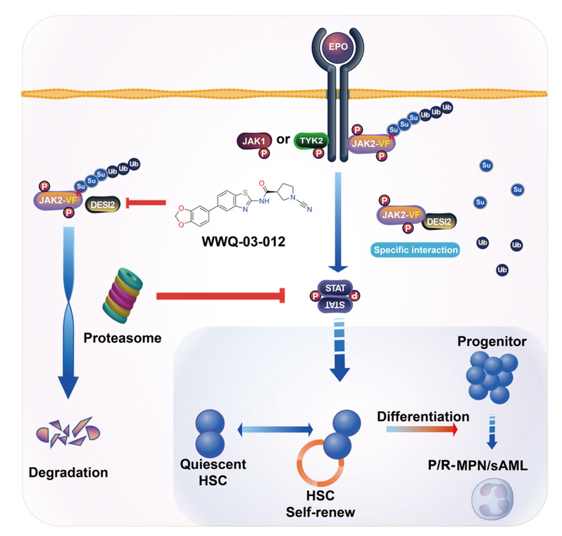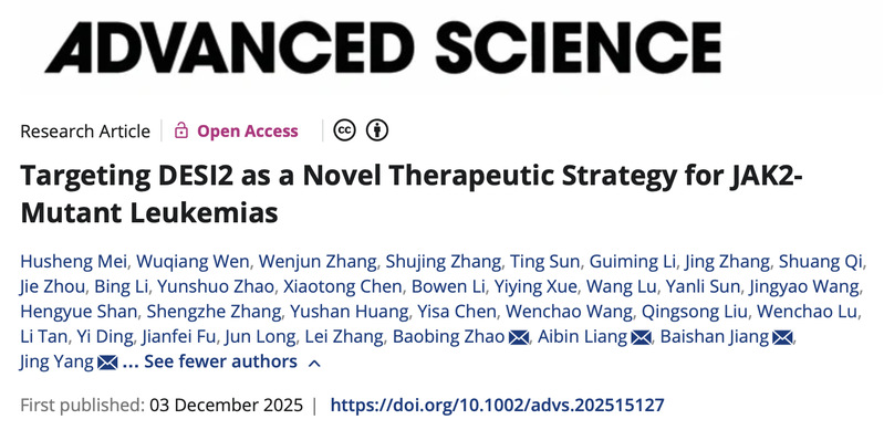 12月3日,同济大学杨静教授,武汉大学蒋白山教授、同济大学附属同济医院梁爱斌教授,山东大学赵保兵教授合作在《先进科学》(Advanced Science)发表研究论文,题为“Targeting DESI2 as a Novel Therapeutic Strategy for JAK2-Mutant Leukemias”。该研究通过多学科协作,首次发现去SUMO化兼去泛素化酶DESI2是维持JAK2-V617F稳定性的“关键守护者”。基于此靶点,研究团队成功开发出能精准诱导突变蛋白降解的小分子抑制剂WWQ-03-012,在临床前研究中展现出显著疗效。该成果不仅为这类难治性血液肿瘤提供了从“抑制”到“清除”的全新治疗范式,也为克服靶向治疗耐药开辟了切实可行的新路径。