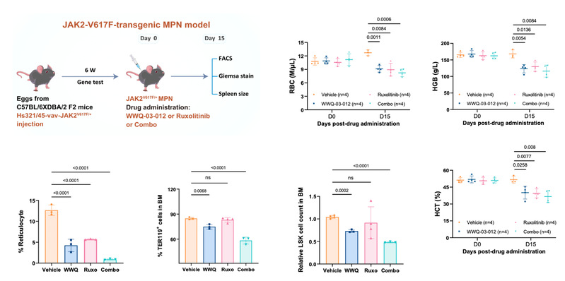 在全面评估环节,WWQ-03-012在细胞层面能够剂量依赖性地降解JAK2-V617F蛋白,选择性抑制突变细胞增殖,而对野生型细胞或正常造血细胞影响甚微。在临床来源的原代细胞中,该化合物同样表现出对JAK2-V617F阳性细胞的选择性抑制。动物实验进一步证实,WWQ-03-012可显著抑制JAK2-V617F白血病细胞在小鼠体内的生长,改善MPN模型小鼠的血象指标,且在健康野生型小鼠中表现出良好的耐受性。尤为重要的是,该化合物能够有效抑制鲁索替尼耐药细胞株的生长,并与鲁索替尼联用展现协同效应,为临床克服耐药提供了有力依据。