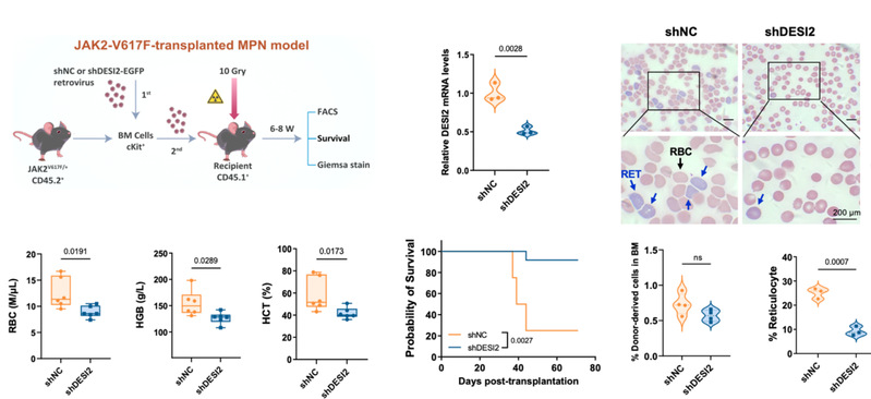 在验证DESI2作为治疗靶点的潜力方面,细胞实验表明敲低DESI2能够选择性降解JAK2-V617F蛋白、抑制下游致癌信号并诱导突变细胞凋亡。在JAK2-V617F阳性白血病异种移植模型中,DESI2敲除显著抑制了肿瘤生长、降低了骨髓白血病负荷并延长了小鼠生存期,而在野生型模型中无此效应。在JAK2-V617F基因敲入MPN模型中,敲低DESI2可有效缓解疾病表征、改善血象并延长生存期,且不影响正常造血功能。