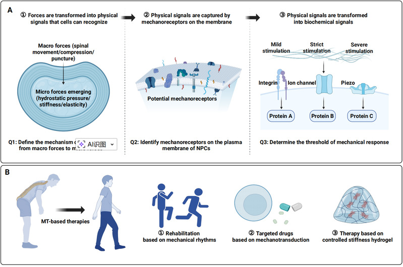 最后,在文章的展望部分,作者进一步从力学生物学视角对椎间盘退变中的机械信号转导过程进行了系统概括,将其概括为三个相互衔接的阶段,并分别对应当前椎间盘生物力学领域亟待解决的关键科学问题。第一阶段关注宏观力学负荷如何转化为髓核微环境中的微观机械刺激,即脊柱运动、压缩和弯曲等宏观力学变化,如何通过水分交换、基质重排和力学分布不均,最终作用于细胞层面;第二阶段聚焦髓核细胞对机械信号的感知与转导,重点讨论整合素、机械敏感离子通道及细胞骨架等结构在机械信号捕获与放大中的作用机制;第三阶段则指向细胞内信号网络如何将机械刺激转化为稳定或病理性的生物学响应,包括基因转录调控、代谢重编程等。基于这三个阶段框架,文章进一步提出了针对性的干预思路,包括通过优化力学节律的康复训练调控宏观负荷,通过靶向机械感受分子干预信号转导,以及利用具备可调力学性能的生物材料重塑局部微环境。该理论框架为理解椎间盘退变的力学本质及发展机制提供了清晰路径,也为机制导向的精准干预策略奠定了基础。