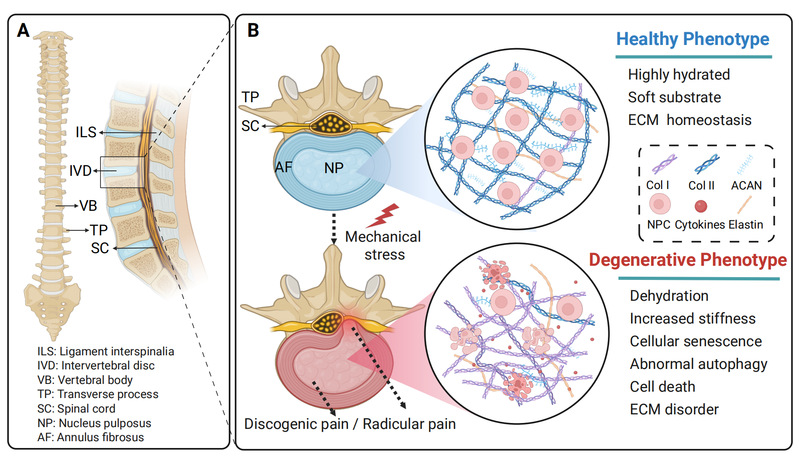 全球范围内,腰痛的高发病率(约1/13)使其成为造成社会医疗负担的主要疾病之一,而椎间盘退变则是其关键的病理解剖学基础。髓核位于椎间盘中央,具有高度水化和显著的力学敏感性,是承受和分配脊柱负荷的关键结构,也是最早发生退变的区域。虽然既往流行病学和影像学研究明确了机械过载、反复弯曲及长期异常应力与椎间盘退变密切相关,但宏观层面的脊柱运动转化为微观病理信号的生物力学转导过程,及其诱导髓核细胞功能衰退的级联反应仍亟待深入探索。因此,基于病理力学框架探究髓核细胞感应并转导异常机械应力的机制,是破解椎间盘退变发生、发展机制的关键环节。