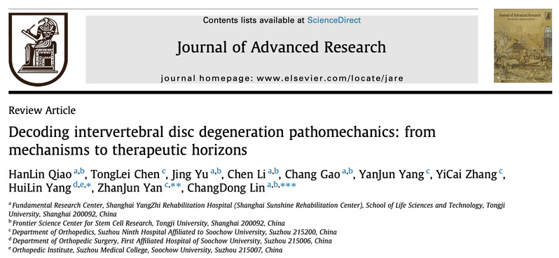 近日,同济大学生命科学与技术学院/附属养志康复医院林昶东课题组联合苏州大学附属苏州九院骨科言湛军主任团队以及苏州大学附属第一医院骨科杨惠林主任团队在国际知名学术期刊《高级研究杂志》(Journal of Advanced Research)在线发表了题为“Decoding intervertebral disc degeneration pathomechanics: from mechanisms to therapeutic horizons”的综述论文。该文从生物力学与细胞力学生物学的整合视角,深入探讨了椎间盘核心结构——髓核在退变过程中的病理力学演进。通过系统分析异常机械应力如何介导髓核细胞稳态的破坏及其驱动退行性病变的分子机制,阐明了力学信号转导在椎间盘退变中的核心作用,为探索新型力学干预疗法奠定了理论基础。