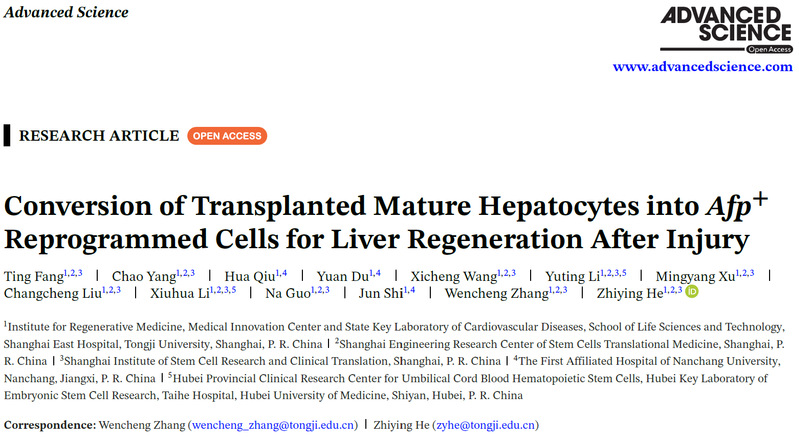 2026年1月29日,同济大学生命科学与技术学院、附属东方医院再生医学研究所何志颖教授团队在Advanced Science发表题为“Conversion of Transplanted Mature Hepatocytes into Afp⁺ Reprogrammed Cells for Liver Regeneration after Injury”的研究论文。该研究综合运用连续移植、谱系追踪、单细胞转录组测序(scRNA-seq)和单细胞染色质可及性测序(scATAC-seq)等技术,首次系统阐明移植成熟肝细胞通过重编程为过渡性甲胎蛋白阳性重编程肝细胞(Afp⁺ rHeps),进而高效驱动肝脏再生修复的细胞命运转变过程与核心调控网络。