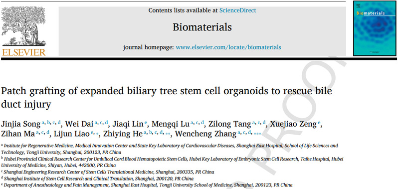 2026年2月5日,同济大学生命科学与技术学院、附属东方医院再生医学研究所张文成研究员、何志颖教授与同济大学附属东方医院疼痛科廖丽君团队合作在Biomaterials发表题为“Patch grafting of expanded biliary tree stem cells organoids to rescue bile duct injury”的研究论文。该研究旨在团队前期建立的BEX-gel体系可实现胆管树干细胞(Biliary Tree Stem Cell, BTSC)类器官体外扩增的基础上,进一步探究了扩增后BTSC类器官是否可作为胆管损伤修复的种子细胞类型,以替代受损的胆管上皮细胞来修复胆管功能,这项工作在体外建立了BTSC类器官向功能性分支样胆管类器官(BTSC-ChOs)分化的CDM体系,在体内通过BTSC类器官补片移植救治DDC诱导的胆管扩张及MDA诱导的胆管缺失两类胆管损伤模型,为临床应用BTSC类器官治疗胆管损伤奠定了基础。