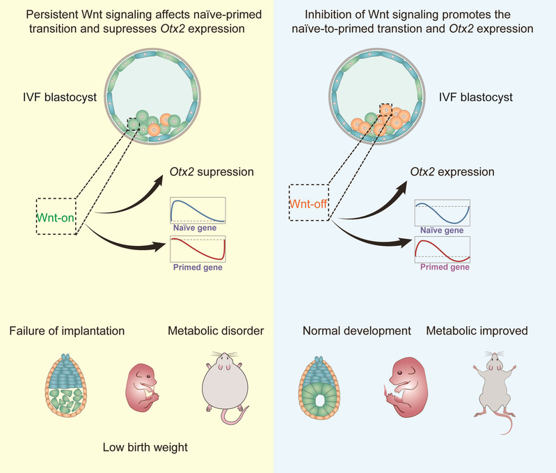 This study reveals that persistent Wnt signaling disrupts embryo implantation in IVF by altering histone modifications (H3K27ac/H3K27me3), blocking the naïve-to-primed pluripotency transition and suppressing key genes like Otx2. Treating embryos with the Wnt inhibitor IWP2 restores normal development, improves implantation rates, and prevents metabolic disorders in offspring. The findings offer a promising strategy to enhance IVF success and offspring health, with early human embryo experiments showing similar benefits. Targeting Wnt signaling could transform fertility treatments.