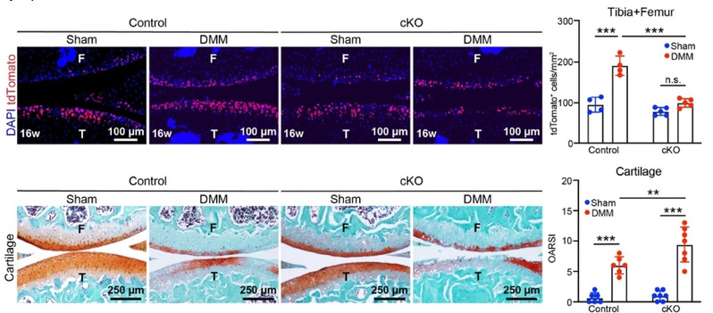 The researchers also discovered that compared to healthy control mice, OA model mice exhibited a significant increase in chondrocytes derived from Procr⁺ cells in the tibia, femur, and meniscus. Importantly, ablation of Procr⁺ cells led to exacerbated joint damage in OA mice, indicating that these cells help delay OA progression through cartilage regeneration. Single-cell RNA-sequencing analysis of superficial zone cells revealed that the transcriptional regulatory network of the mechanosensitive transcription factor Klf2 was activated in the OA group. Klf2 mediates mechanical signal transduction via Piezo1/2 and Trpv4 ion channels, with Piezo1 being most highly expressed in superficial zone cells. Notably, deletion of Piezo1 resulted in a significant reduction of progeny chondrocytes derived from Procr⁺ cells in OA mice and more severe OA symptoms.