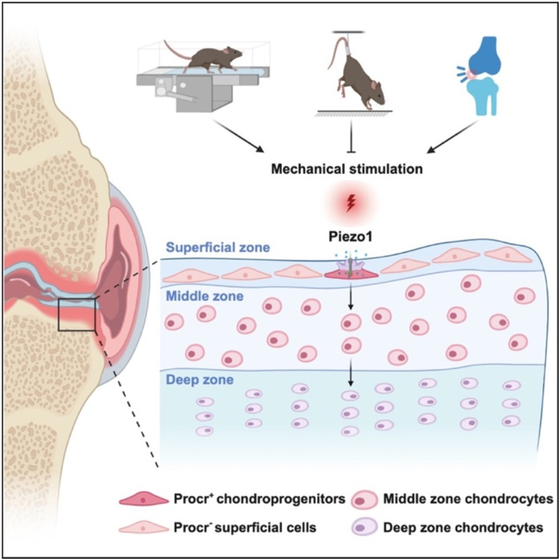 In conclusion, this study identified mechanosensitive Procr⁺ chondroprogenitors in the superficial zone of mouse knee joint cartilage and meniscus, which play a fundamental role in maintaining cartilage homeostasis and promoting regeneration via Piezo1-mediated mechanotransduction. Furthermore, human PROCR⁺ cells were shown to be a potential source for cell therapy to efficiently regenerate articular cartilage.