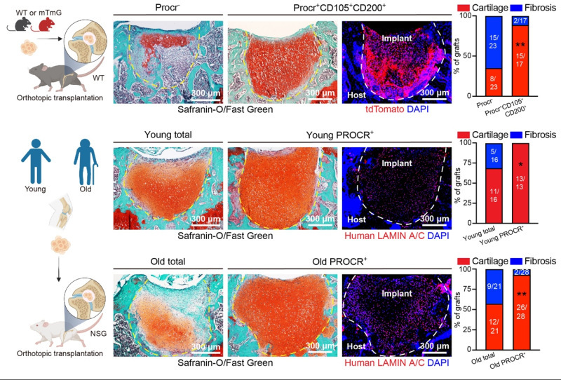To assess the regenerative potential of Procr⁺ cells, researchers isolated Procr⁺ cells and performed 2D expansion, 3D sphere culture, and in vivo transplantation experiments. Procr⁺ cells demonstrated robust clonogenicity and chondrogenic differentiation potential. In both ectopic renal subcapsular transplantation and orthotopic cartilage defect transplantation, Procr⁺ cells exhibited superior cartilage regeneration ability. Importantly, similar PROCR⁺ cells were isolated from articular cartilage samples of both young and old human donors. In vivo transplantation showed that these human PROCR⁺ cells possess more robust cartilage repair capabilities as compared to mature chondrocytes.