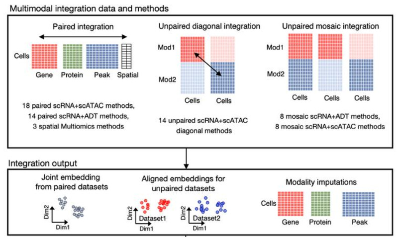 In tasks with partially or entirely unmatched modality information, several deep generative models showed remarkable performance. For partially matched mosaic integration tasks, the MIDAS algorithm demonstrated superior hidden space accuracy and stability. In cross-modal generation tasks, MIDAS significantly outperformed similar algorithms, achieving accuracy levels comparable to supervised multi-modal generation models (with 10% of the predictive modality as input). For completely unpaired diagonal integration tasks, the GLUE algorithm excelled in all modality alignment accuracy metrics, achieving alignment performance comparable to mosaic integration algorithms with partial pairing information. In spatial omics integration tasks, existing algorithms in the field did not exhibit significant advantages over classical analysis tools (e.g., Harmony, STAligner), highlighting the need for innovating spatial multi-omics integration methods.