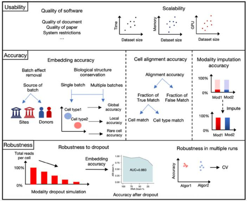 The platform establishes a three-dimensional evaluation framework and process for usability, accuracy, and stability tailored to different application scenarios of multi-modal integration (Fig. 2). The usability metrics assess whether algorithms can function properly across datasets of varying sizes (ranging from 500 to 500,000 cells) and on different hardware platforms (CPU/GPU acceleration). The accuracy metrics, which do not rely on gold-standard data for multi-modal integration, evaluate three hidden space metrics: biological structure preservation, batch effect removal, and cell alignment, as well as cross-modal generation accuracy. Stability metrics measure the consistency of algorithm performance and results across multiple runs and under varying data quality of different modalities.